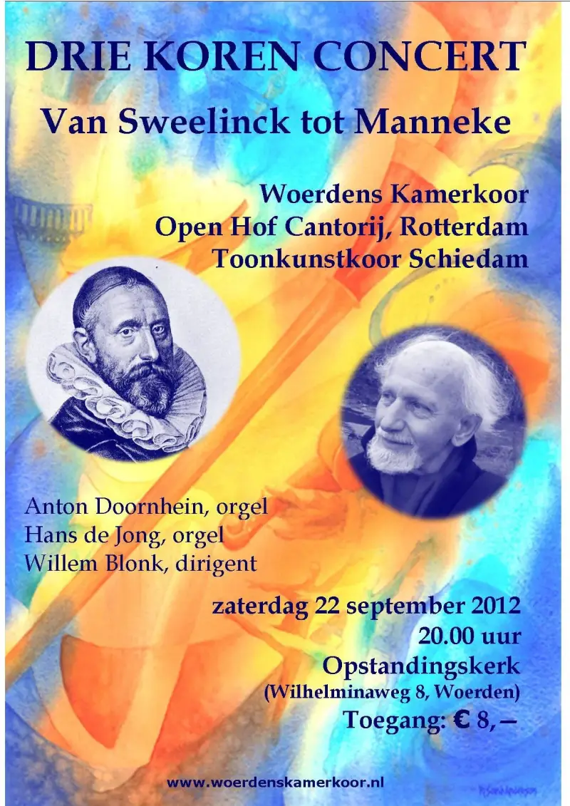 - 16, 22 en 23 september: In samenwerking met Toonkunstkoor Schiedam en de Open Hofcantorij werden drie concerten gegeven met een reis door vier eeuwen Nederlandse koormuziek. De concerten vonden plaats in de Grote Kerk Schiedam, de Opstandingskerk te Woerden en de Open Hof in Rotterdam. Werken van Sweelinck, Daan Manneke, Hans Leenders, Kees Bak, Jan Welmers, Julius Röntgen, Jurriaan en Hendrik Andriessen werden uitgevoerd, met medewerking van organisten Anton Doornhein en Hans de Jong.